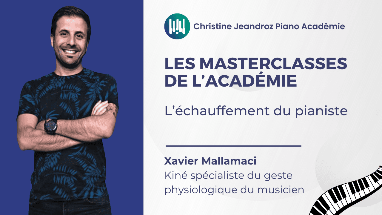 Masterclasse sur l'échauffement pour le pianiste Réalisée par un kiné des musiciens, Xavier Mallamaci. Il explique pourquoi un bon échauffement est important et surtout, comment ...